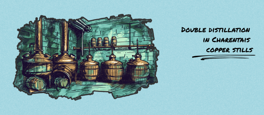 - Double distillation in Charentais copper stills.