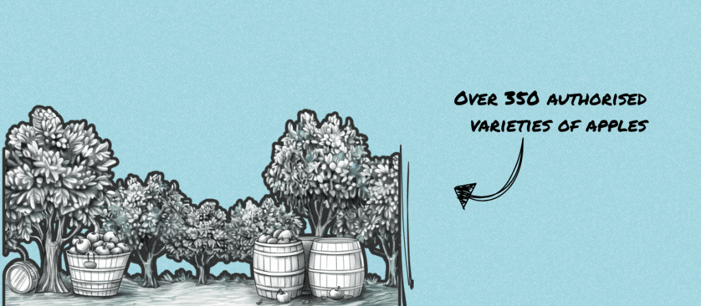 - Apples: Over 350 authorised varieties, bred specifically for cider-making. They’re divided into four flavour categories – bitter, sweet, sour, and bittersweet. Only hand-picked fruit is allowed; windfalls are banned. Pears are also permitted (about 50 varieties).